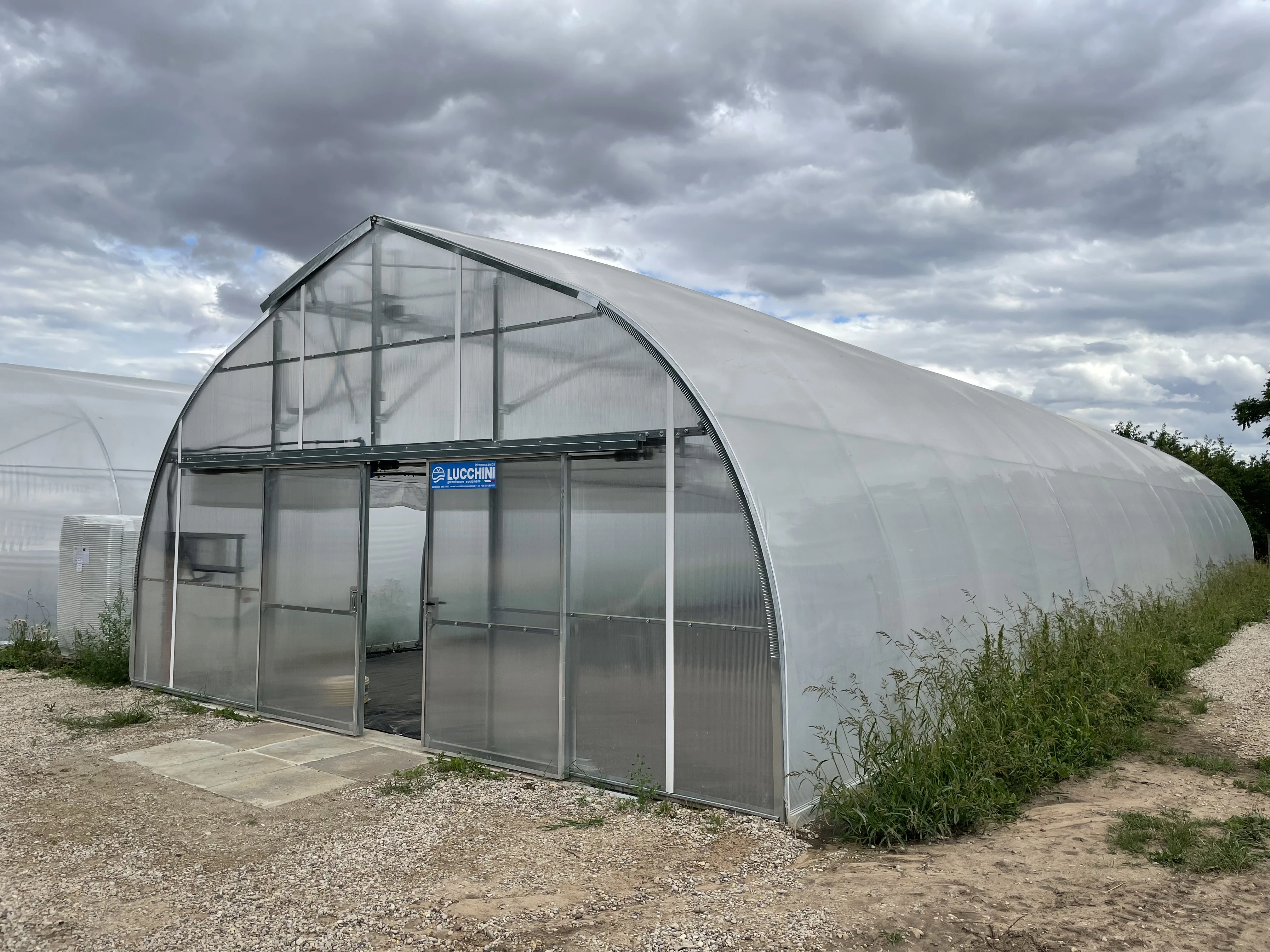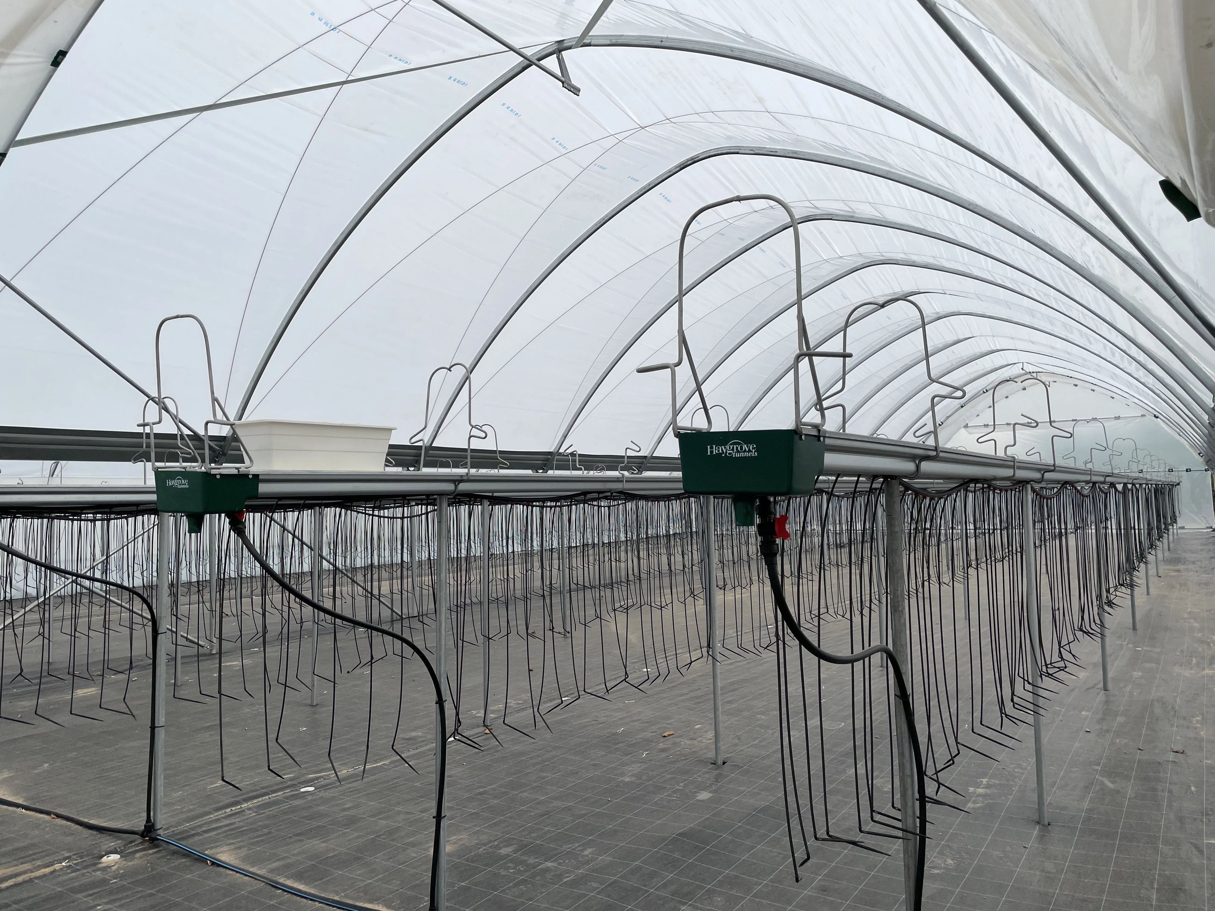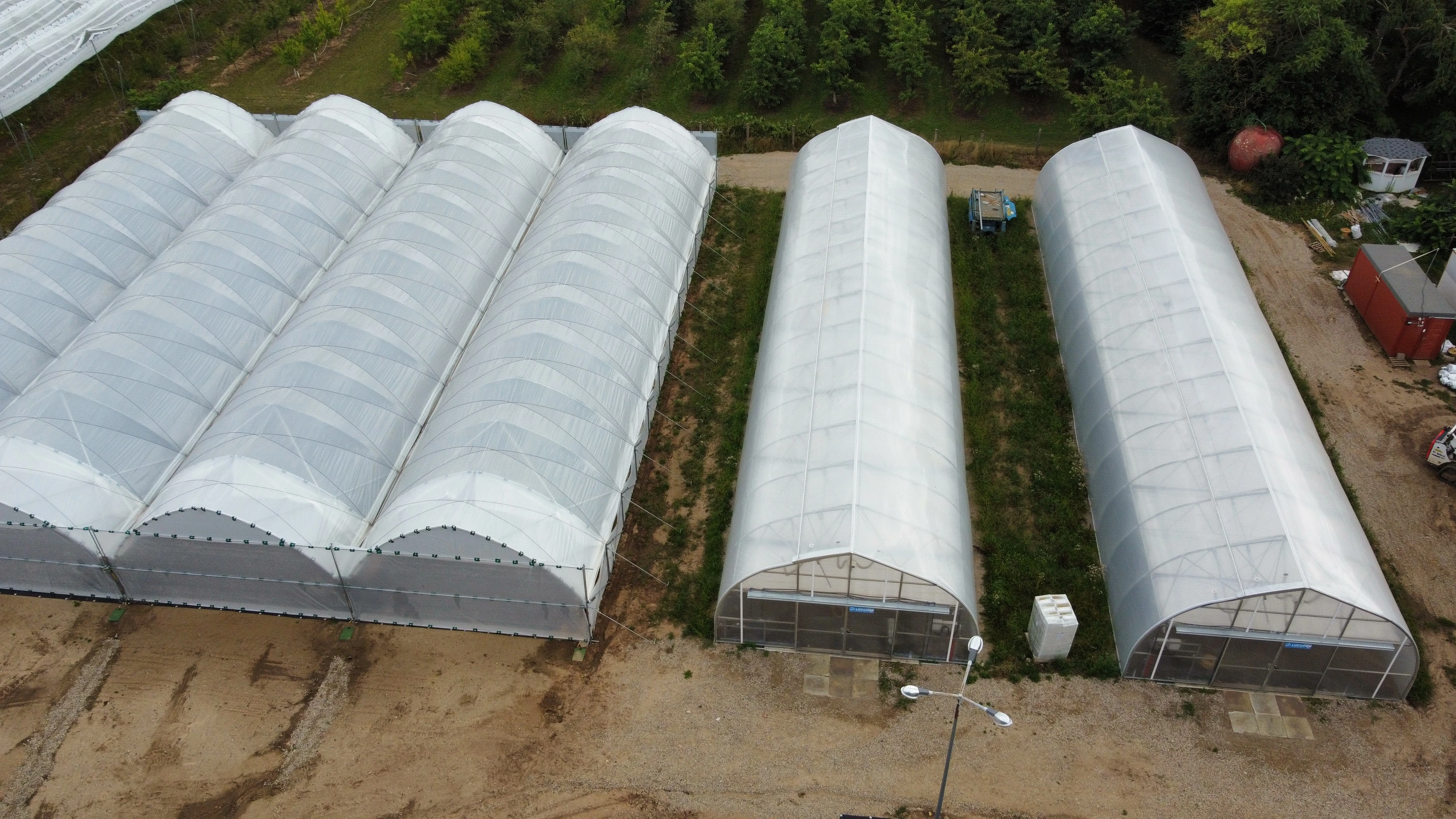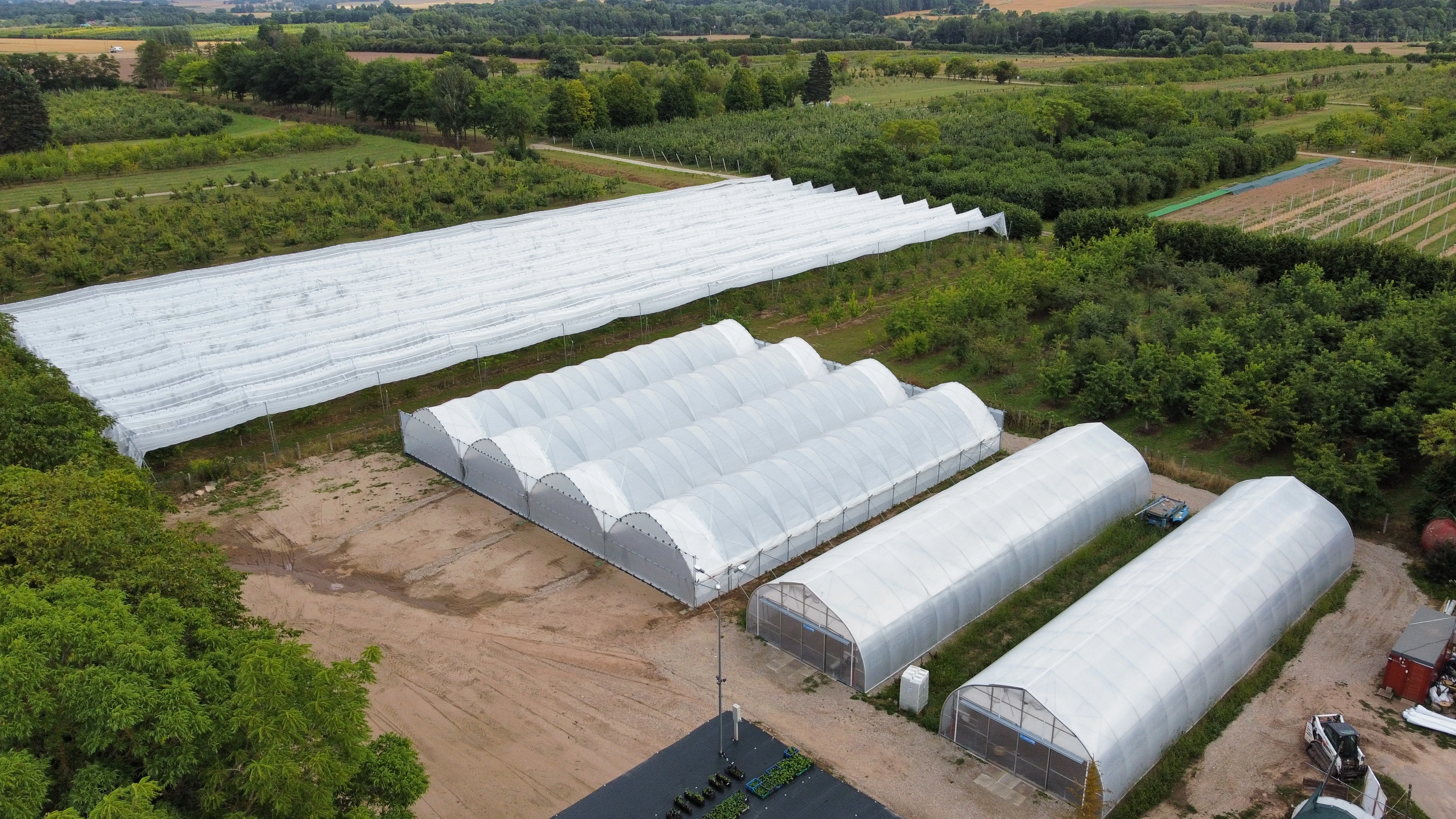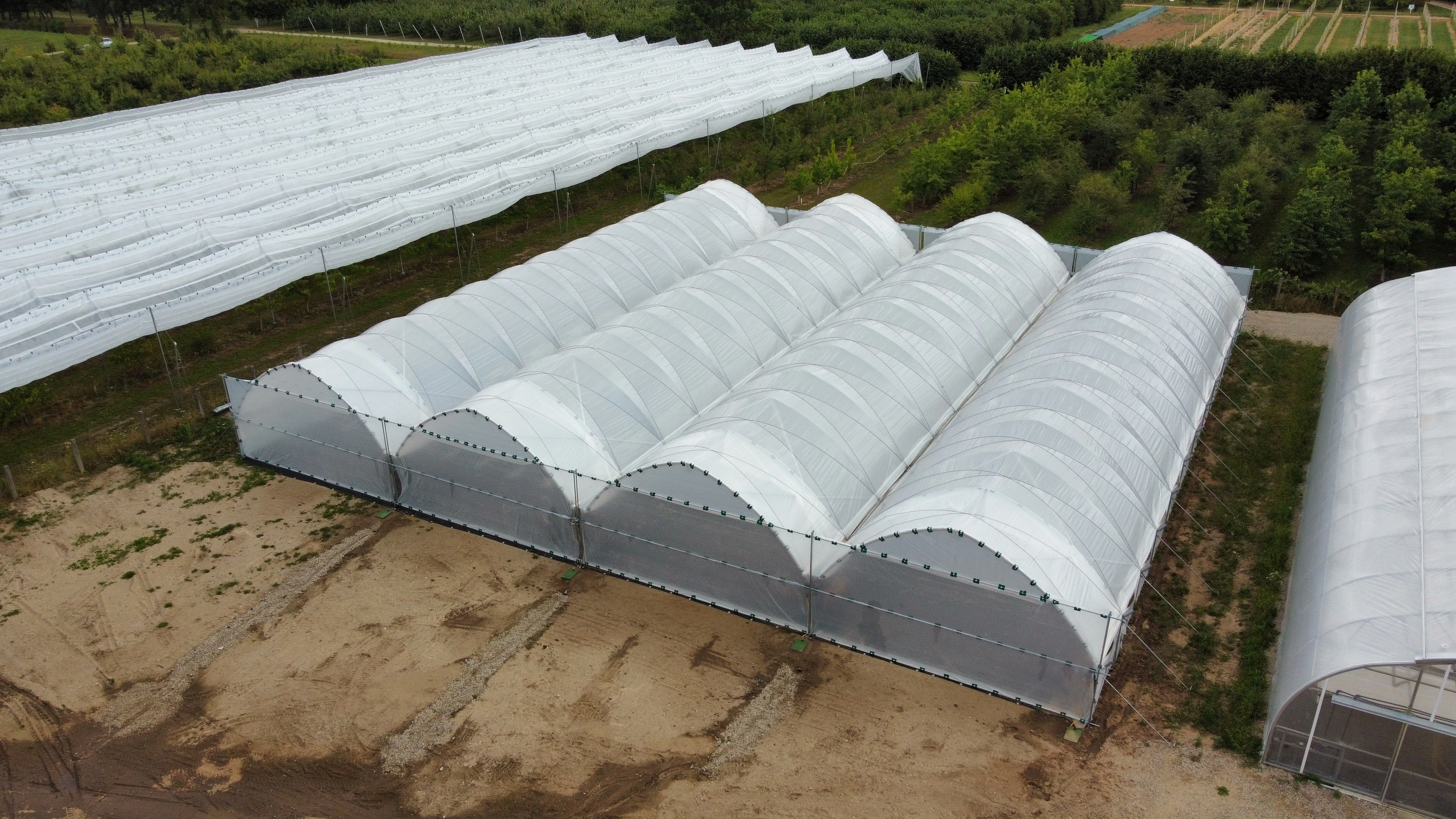 Installation av plastfilmtunnlar och tunnlar/växthus för hallon-, jordgubbs-, körsbärs- och grönsaksförsök i trädgården vid Trädgårdsinstitutet i Dobele.